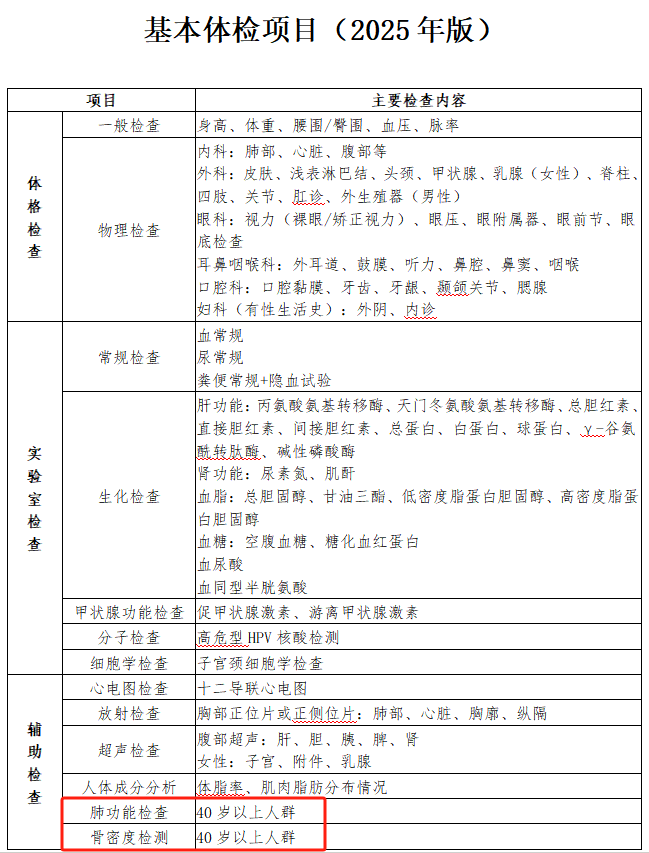 作為18歲以上成人健康體檢的重要參考標準,《指引》的基本體檢項目涵蓋體格檢查、實驗室檢查、輔助檢查三大類,而此次新增的兩項檢查,正是針對40歲后高發的呼吸系統疾病和骨骼健康問題的精準補充。無論是職場中堅還是退休人群,都需要及時關注這一變化,讓體檢真正成為健康的“預警雷達”。