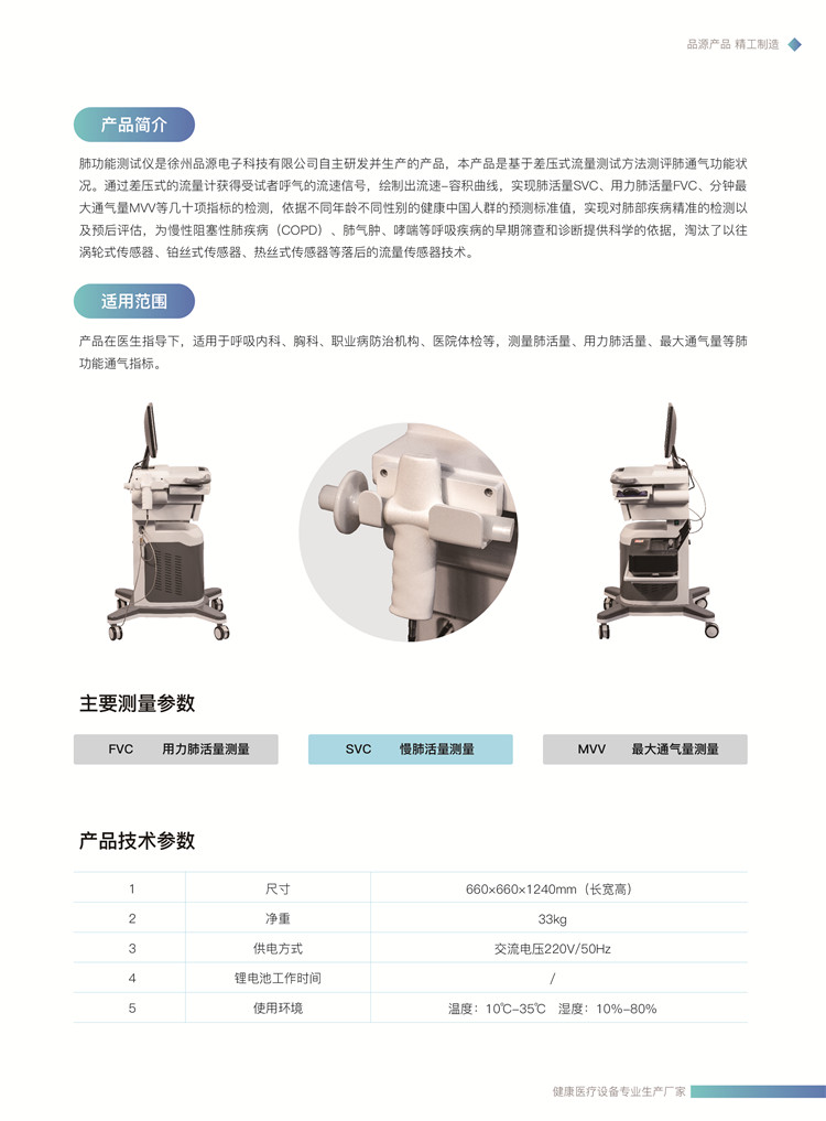 肺功能儀適用范圍:產品在醫生指導下,適用于呼吸內科、胸科、職業病防治機構、醫院體檢等,測量肺活量、用力肺活量、最大通氣量等肺功能通氣指標。